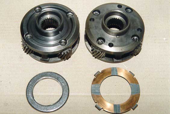This is a photo of the two different front planetary assemblies that can be found in the T/350 transmission, one with a Torrington bearing and the other with a thrust bearing. All Extreme T/350 transmissions are built using the Torrington based front planetary.