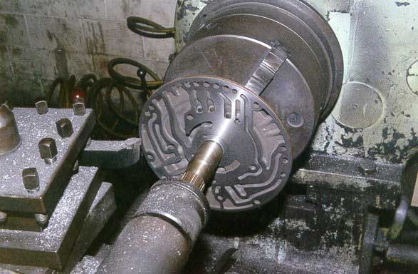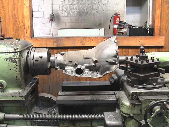 This shot shows a T/350 case having its forward mounting surface ( Bell Housing ) machined square to the alignment of the transmission tunnel. The lathe that we bought to do this job weighs over 7 tons and is over 14 feet long.