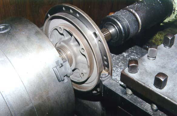 When machining the front pump surface, the rear thrust surface must also be machined for perfect alignment, this must be done without removing the rear pump half from the lathe.